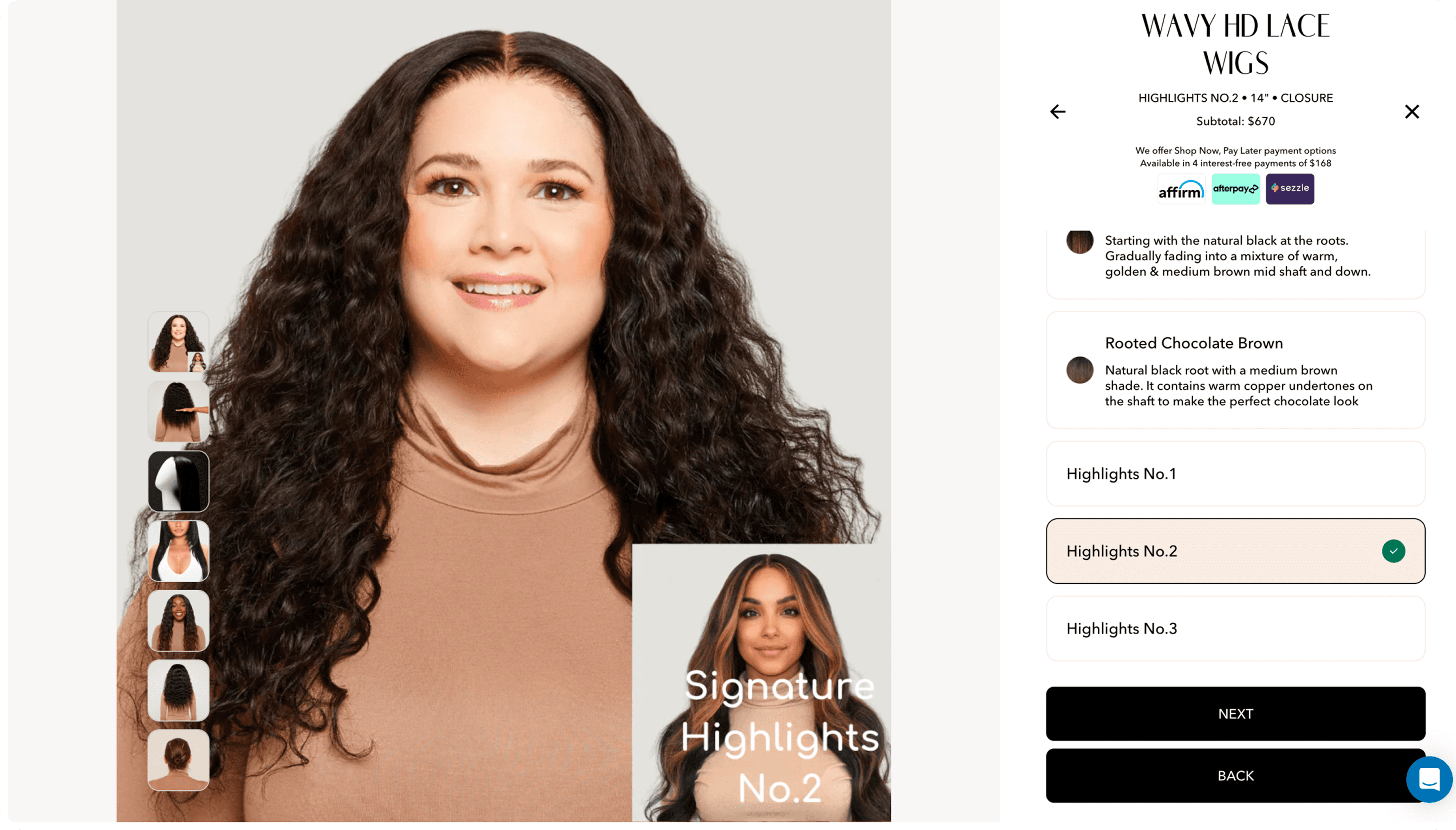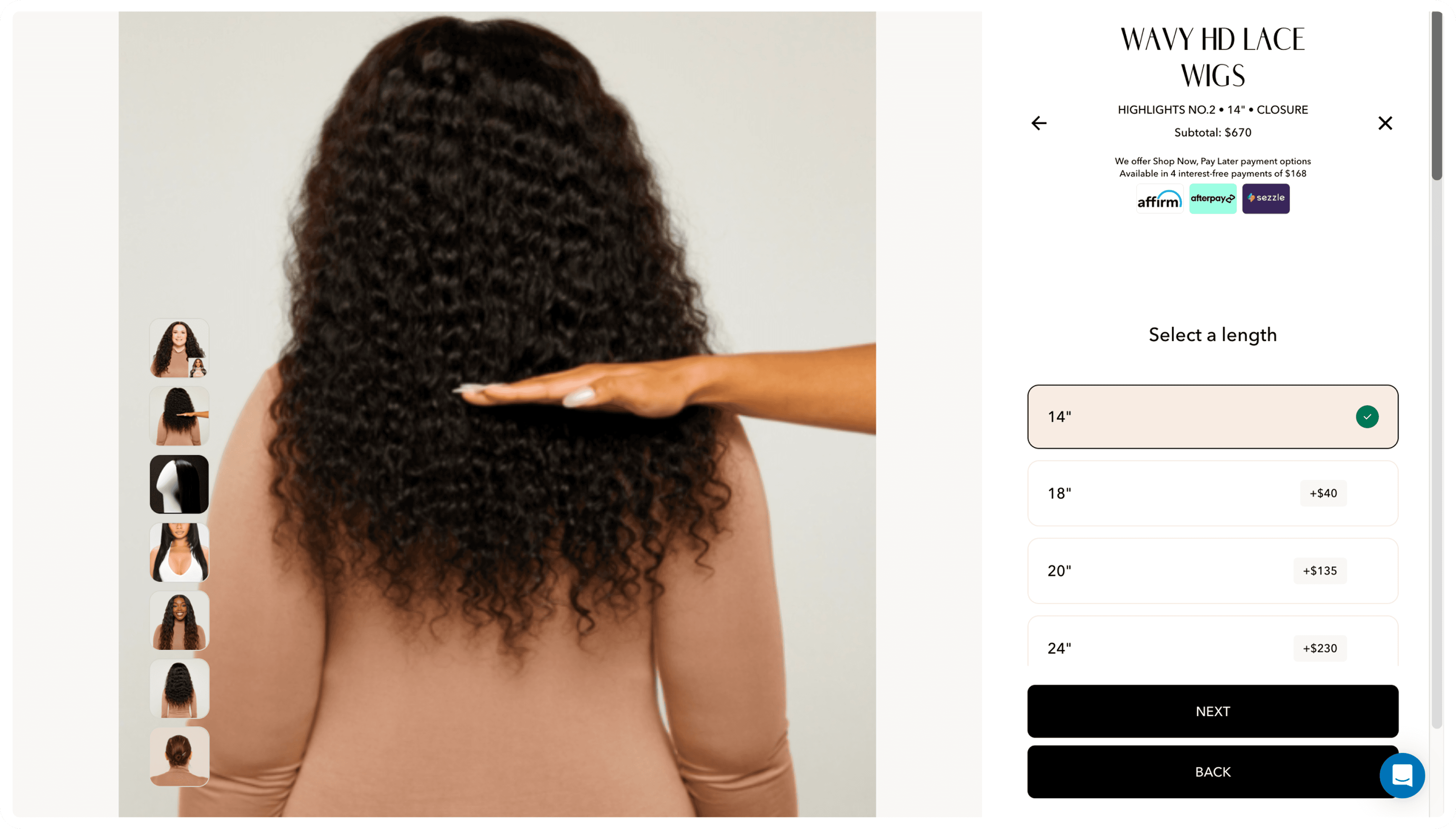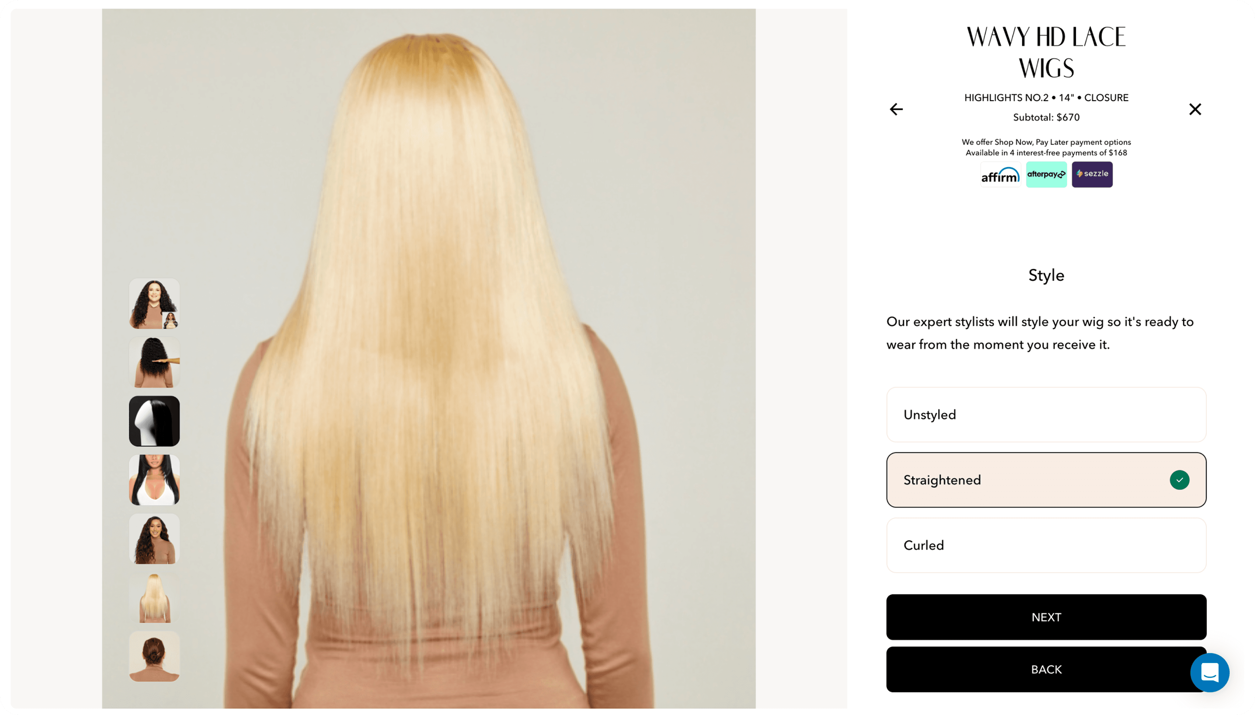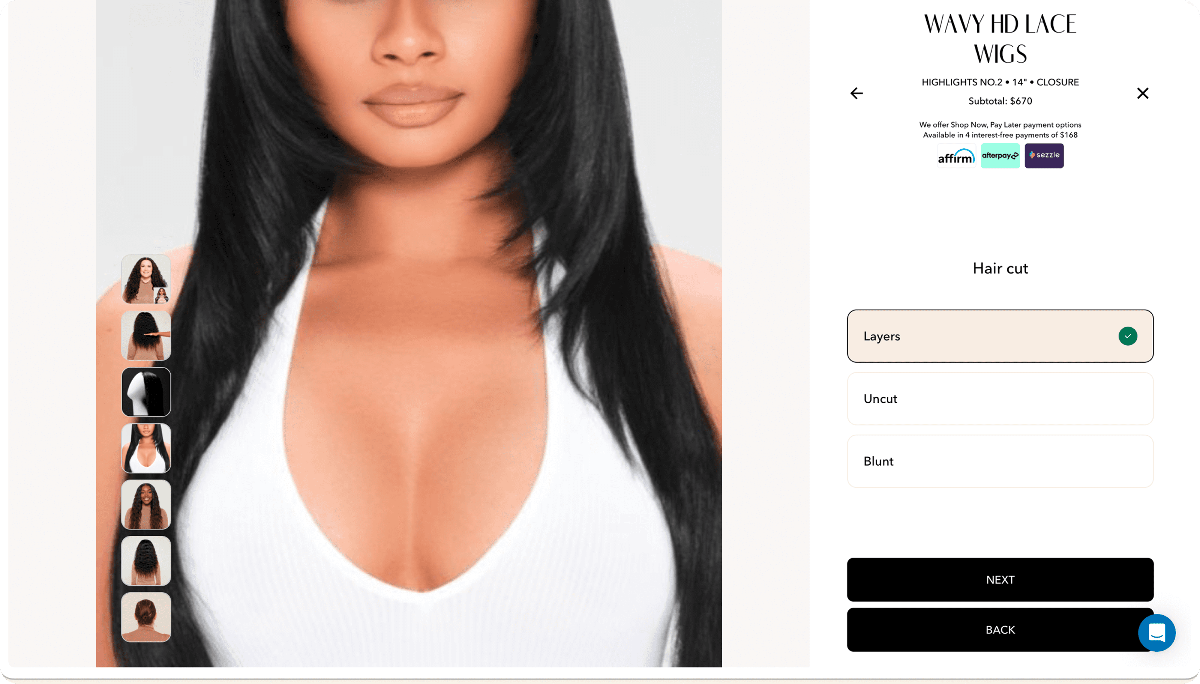 Real-time changes are reflected immediately on the model. Users can inspect the wig from 3 unique angles. Price impact are clearly labeled, subtotal are updated dynamically.